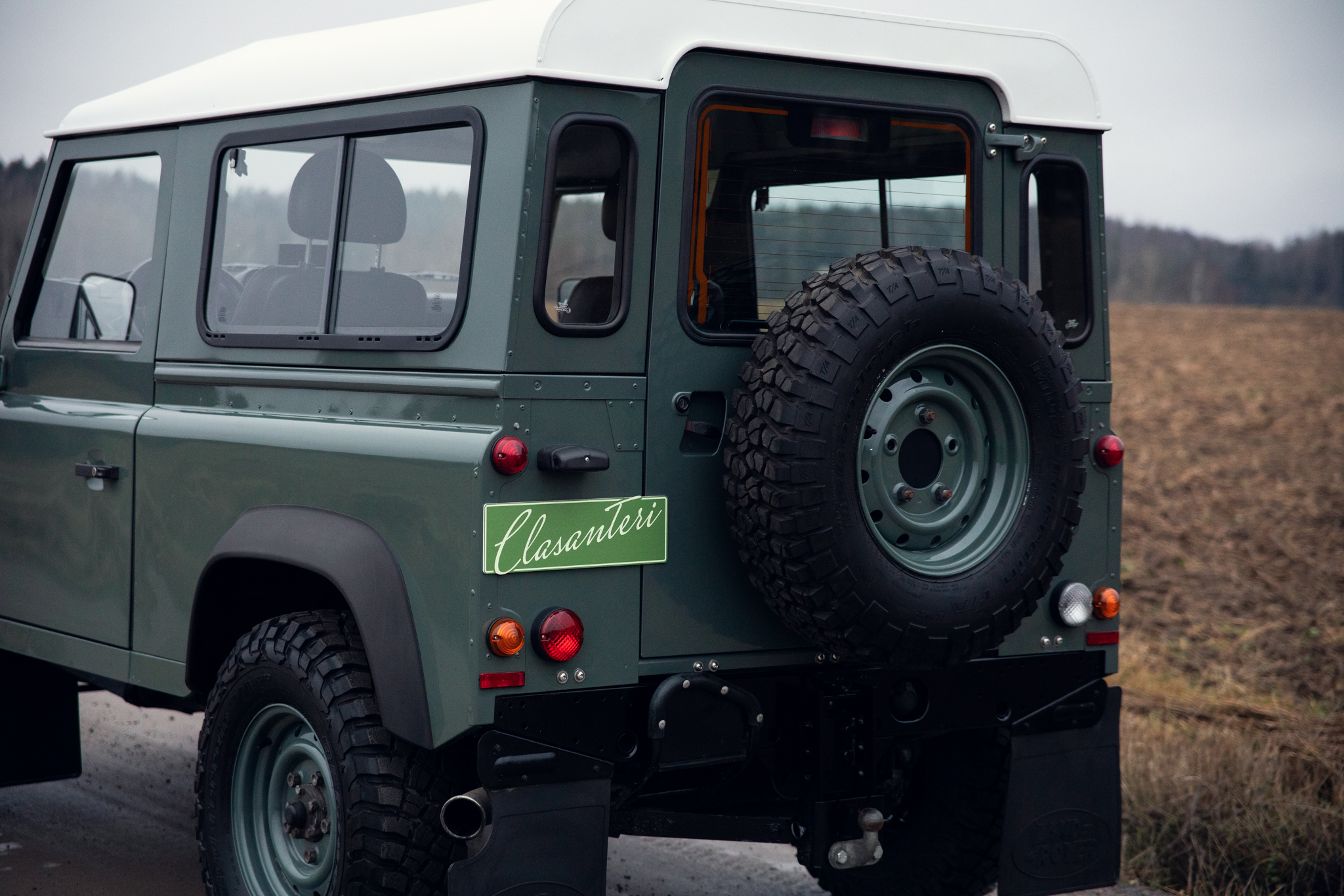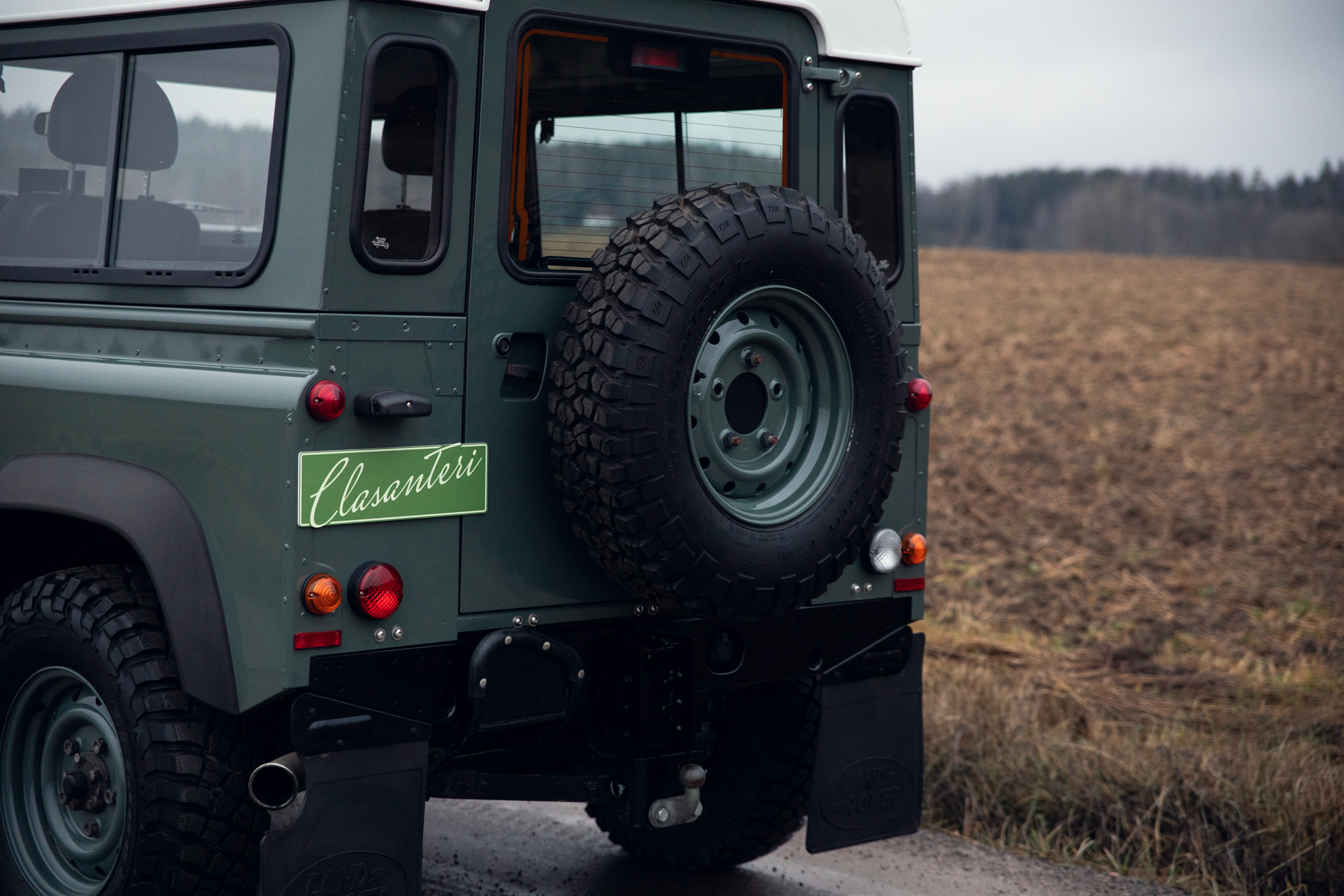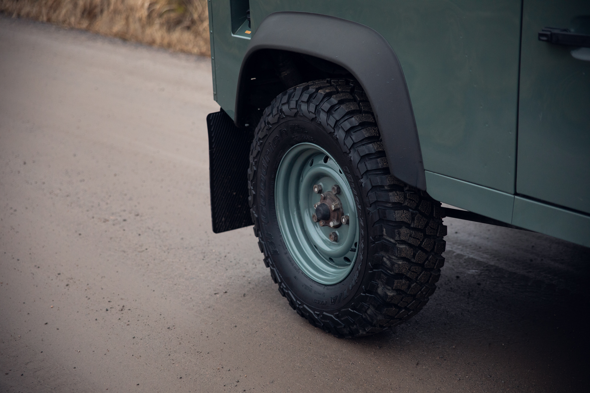 We equipped the car according to the Heritage special model: The car was fitted with a new Heritage grille and front light surroundings painted in the body color, as well as Land Rover’s original Wolf wheels. New BF Goodrich MT tires in the original 235/85/16 size were installed on the wheels. The new front bumper was painted in an aluminum silver tone.