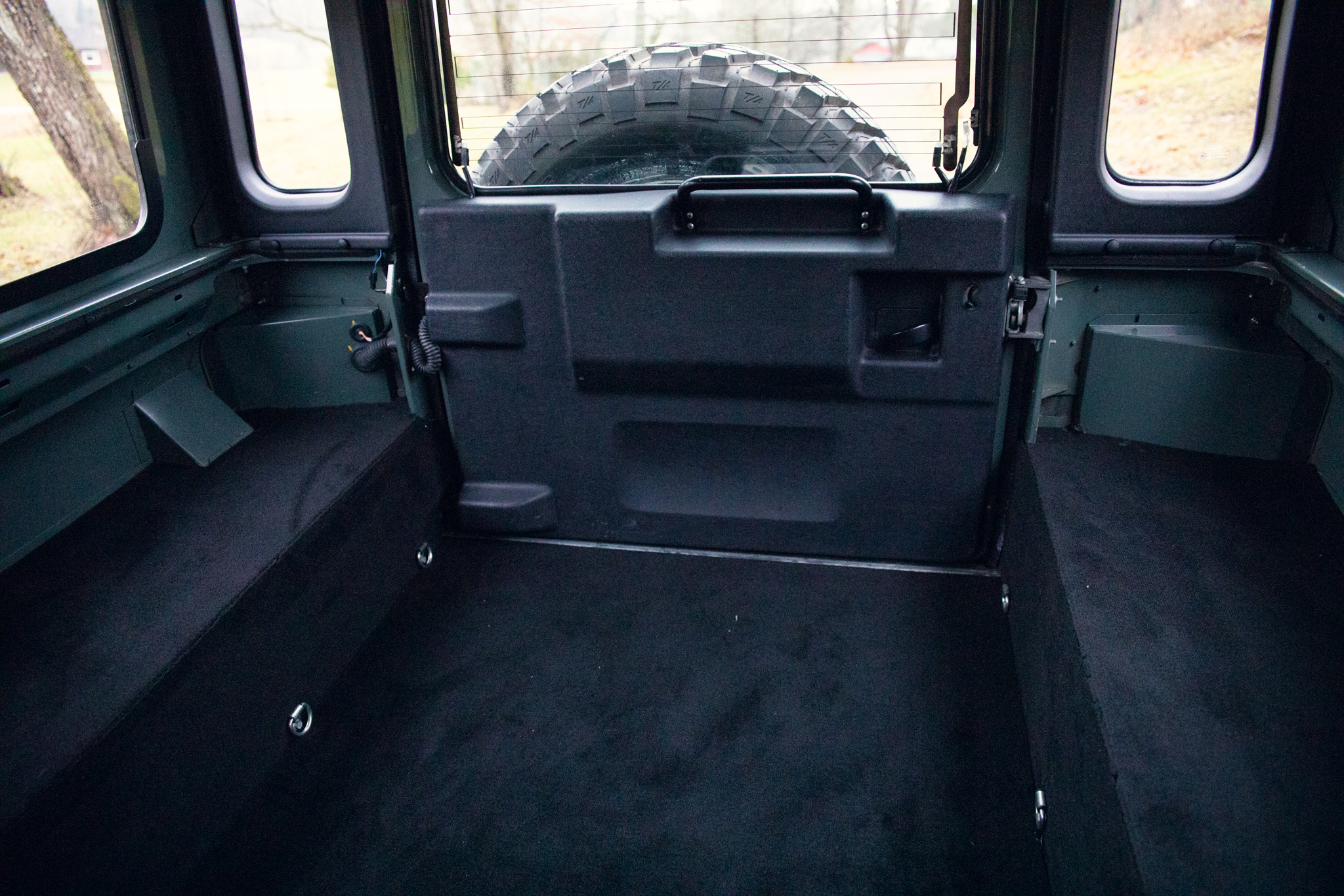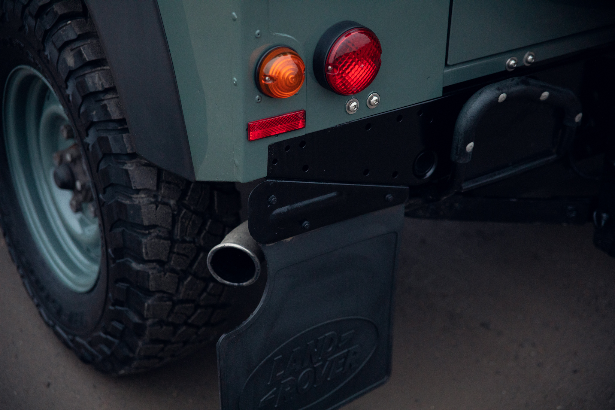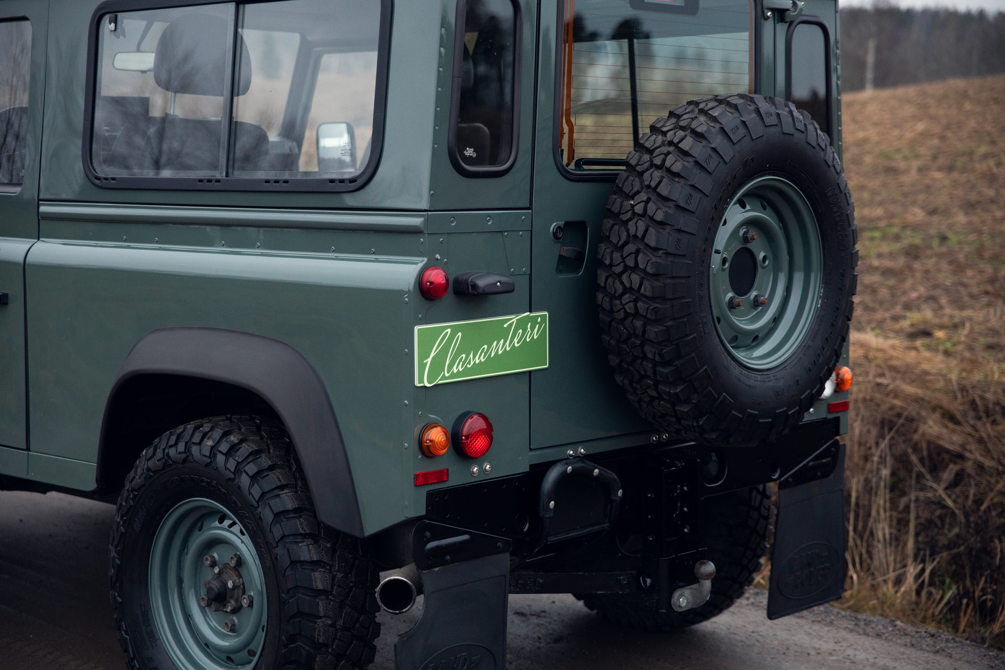 We equipped the car according to the Heritage special model: The car was fitted with a new Heritage grille and front light surroundings painted in the body color, as well as Land Rover’s original Wolf wheels. New BF Goodrich MT tires in the original 235/85/16 size were installed on the wheels. The new front bumper was painted in an aluminum silver tone.
